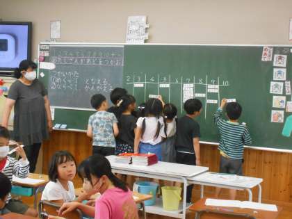 「たしざんかあど」を使ってたし算の練習です。答えが同じになるカードをみんなで協力して集めていました。こうして、10までのたし算が段々と身に付いていきます。「このあとは」ひき算で同じような学習をしたり、カードを並べて気付いたことから数の仕組みをさらに深く学習したりします。