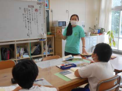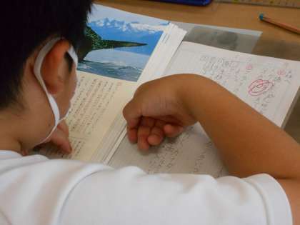 6年生は「森へ」を読み、アラスカの世界とザトウクジラについて関心をもって読み取っていました。「ここでは」本と自分との関わりを考えたり、テーマに着目して読み広げたりすることのよさを感じたりします。「森へ」を読み、児童は、迫力のある自然の写真とともに、自然の営みについて感じることができます。