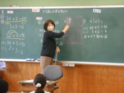 「ここでは」かけ算の筆算ができるようになります。ちょうど教室では、14×2の筆算の仕方を皆で確認していました。「たし算やひき算のひっ算のときと おなじように やればいいんだよ」と児童は進んで「これまで」の学習をもとに考え、位を揃えて書いたり、かけ算記号の場所を正しく書いたりします。そして、「これまで」は3回に分けて考えていたこの計算を筆算で考えると速く正確にできることのよさを感じていました。
