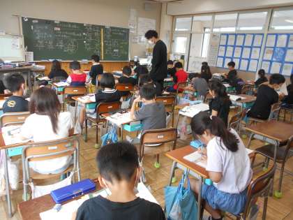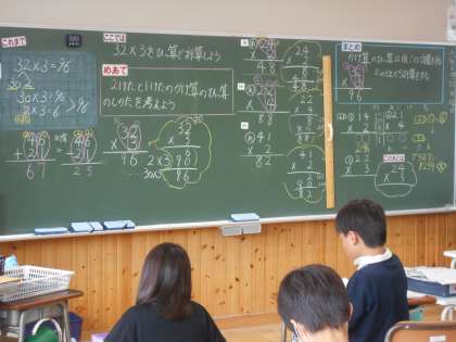 「かけ算の筆算」の学習では、2けたと1けたのかけ算の筆算の仕方を考えていました。一つ一つ丁寧に大切なポイントを確認しながら計算をし、先生から○をつけてもらっていました。そして「このあとは」繰り上げのある筆算を学習することを知り、さらにワクワク期待が膨らみます。