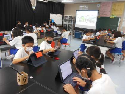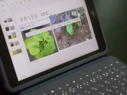 6月15日(木)4年生 理科 公開日 2023/06/15 更新日 2023/06/15 できごと 4年生では「季節と生物」の学習で、ツルレイシの観察を続けています。今日は、植え替えをしました。「ここでは」植物の成長と気温の変化を関係づけて考えます。なので、記録にはしっかりと気温を明記します。そして観察記録をしっかりタブレット上に残していき、植物の成長と環境との関わりを学んでいきます。ずっと継続して観察を続けているので、4年生にとっては「大切なツルレイシ」です。植物を愛する心も育っています。