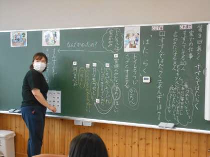 6月15日(木)3年生 道徳 公開日 2023/06/15 更新日 2023/06/15 できごと 「はた・らく」を通して、「すすんではたらく」ことを考えていました。ちょうど教室では、トイレ掃除に対する気持ちと行動が変わった「ぼく」の心の変化について考えていました。3年生になると、身のまわりの生活の中で友達や家族のためにできることを見付けたり、みんなのために働く、力を合わせて働くことの喜びを味わったりすることができるようになります。クラス全員の考えが黒板に示されていきます。