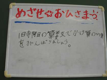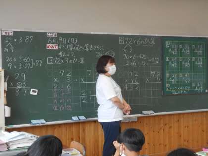 6月19日(月)3年生 算数 公開日 2023/06/19 更新日 2023/06/19 できごと 「1時間目の算数でかけ算のひっ算をがんばりましょう」とみんなで決めた目標が掲げてありました。授業では宣言通り、本当に真剣に学習をしていました。今日は、2けたと1けたのかけ算の筆算の発展編で繰り上げのある計算の仕方を考えました。自分たちで「がんばるぞ!」と決めたことをみんなで一生懸命できるクラス、とても素晴らしいです。