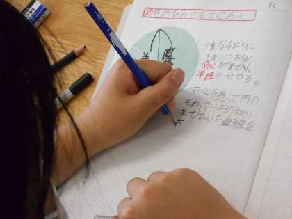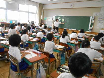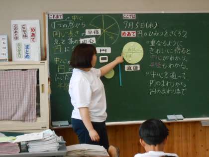 「円と球」の学習です。ちょうど教室では、「円のひみつ」として「直径」をどう説明するか、皆で考えていました。児童は「これまで」学習してきた言葉を使うことにこだわって一生懸命考えてました。そして、いい形に言いたいことがまとまり、みんな一緒に満足そう!嬉しそうにしていて、参観していた私もなんだか嬉しくなりました。