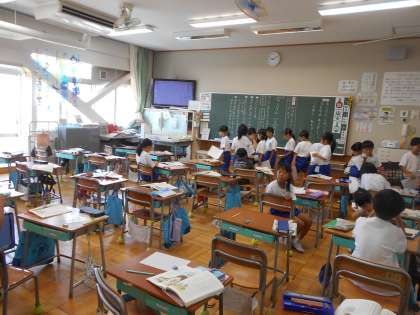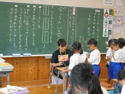 「おむすびころりん」を楽しく学習している1年生です。ちょうど教室では、先生の前に行列ができていました。お話の最後を内容を楽しみ、このお話の好きなところとその理由を文章に書いて、先生に読んでもらっていました。楽しくみんなで学習しましたが、お話の好きなところは友達によってそれぞれ違うなということも気付いていた1年生です。お話を読む楽しさをこのあともたくさん味わってほしいですね。
