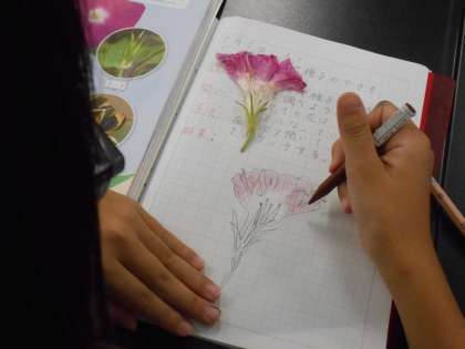 理科室に入ると、皆シーンと集中してノートに向かっていました。アサガオの花のつくりを調べていました。持ってきたアサガオの花を開いて、見えているものを細かく丁寧にスケッチしていました。じっくり見れば見るほど花のつくりについて知りたくなっていたようでした。そんな話を児童としていると、「だから理科のお勉強は好きなんです!」と言っていた児童がいました。花のつくりだけでなく、花粉や受粉、実や種子のでき方なども学びます。いつもこうしてワクワクしながら理科を学んでいます。