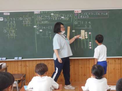 「はるかさんは134円もっています。53円のドーナツを買うと、何円のこりますか」今日はひき算の筆算の仕方を学習していました。はじめて計算する形ですが、「これまで」学習した筆算の仕方を思い出したり、図を使って考えたりしながら考えていました。「ここでは」くり下がりがあるいろいろなひき算ができるようになります。