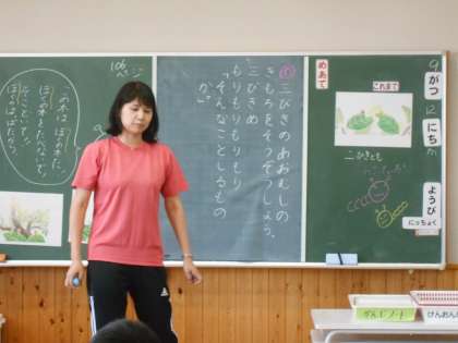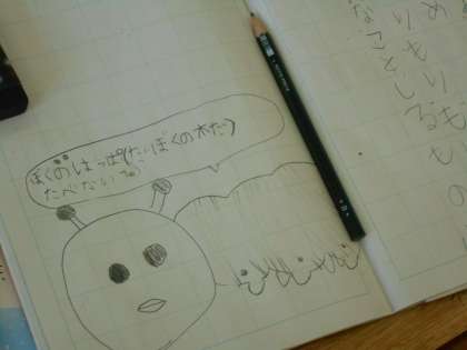 9月12日(火)1年生 国語2 公開日 2023/09/12 更新日 2023/09/12 できごと 3組では、3匹目のあおむしさんの気持ちを想像していました。あおむしさんになりきった児童がノートに絵と言葉で表していました。「ここでは」教科書7ページ分もある長いお話を読みます。1年生には、文字とともに、お話のストーリーが絵で頭に入り、読むことを楽しんでいます。