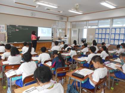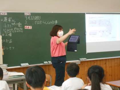 「工場ではたらく人のしごと」の学習に入ったようです。教室に入ったときは、まだ「めあて」が示されておらず、児童と先生で市内の工場の数やそこに働く人の数に関するグラフ資料を見て、小野小と比べて驚いたり、知らなかった発見、なんで?という疑問が生まれたりしていました。そして「ここでは」どんな学習を進めていくのかを知り、やる気や楽しみがいっきに増します。