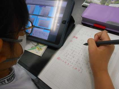 9月27日(水)5年生 理科 公開日 2023/09/27 更新日 2023/09/27 できごと 「流れる水のはたらきと土地の変化」の学習に入りました。普段の川と大雨のときの川の様子を写真で見て、そのちがいについて考えていました。じっくりと写真を見たり、4年生「これまで」学習した雨水のゆくえの学習内容を思い出したりしながら考えます。そして友達の考えたことをタブレットで見ていました。こうして、どうしてかな?どうなるのかな?「ここでは」学習したい!という気持ちがわいてきたようです。