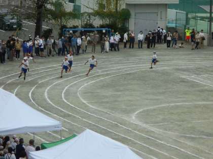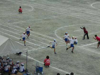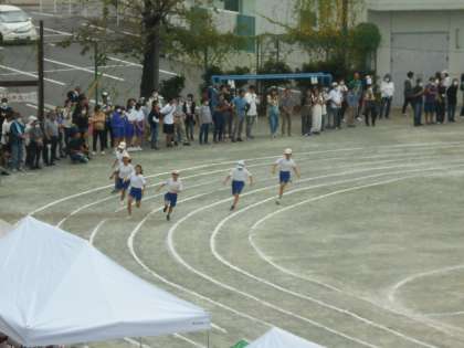 5年生、6年生ともに100m走です。真剣に走る姿に、他学年からも応援の声がとんでいました。頑張る人の姿には精一杯の応援の声を届けたくなりますね。