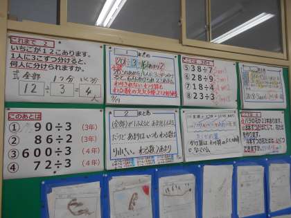 10月4日(水)3年生 算数 2 公開日 2023/10/04 更新日 2023/10/04 できごと 「大きな数のわり算」の学習がおもしろくなってきました!「算数のお勉強はつながっている!」「3年生でやっていることをつかえば4年生の計算もできちゃう!」チャイムの音を無視するほど、「このあとは」4年生の計算に挑戦していました。