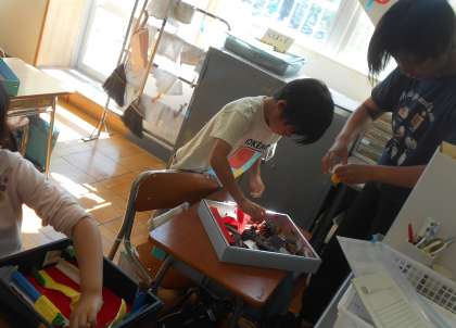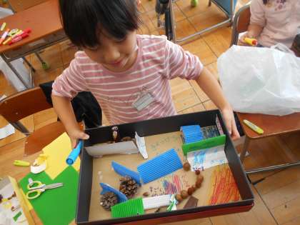 10月16日(月)1年生 生活科 公開日 2023/10/16 更新日 2023/10/16 できごと 1年生は生活科で、どんぐり、まつぼっくりなどの秋のものを活用しておもちゃづくりに夢中です。空のペットボトルや段ボールなどおうちから持ってきた物も活用します。なぜ夢中なのかといったら、来月、地域の保育園、こども園の園児(来年度入学する子)を迎えて遊ぶからです。自分が楽しむのではなく、お友達が楽しめる物を考えているから夢中です。