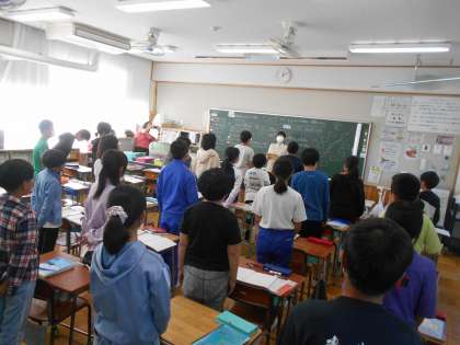 明日から産・育休に入る職員と、いったんお別れの日でした。5年生は算数、家庭科、2年生は読書の時間でお世話になり、子供たちから「元気な赤ちゃんを産んでくださいね」とたくさんの温かいメッセージをもらってお休みに入りました。給食時に全校児童に放送で挨拶をしてもらいました。こうしてお腹の中で元気に赤ちゃんが育っているのも、いつも安全に気を付けてくれたり、優しく声かけをしてくれたりした小野小の子供たちのおかげです!と感謝、感激していました。やさしくあたたかい子供たちのことを素晴らしいと誇りに思います。元気な赤ちゃんを産んでくださいね!