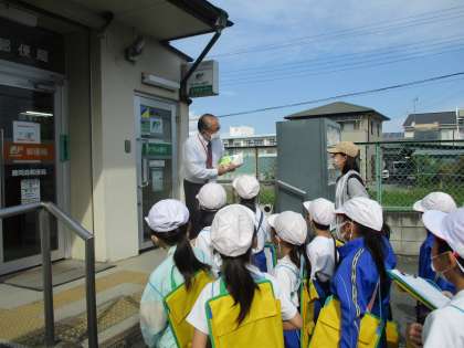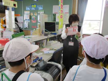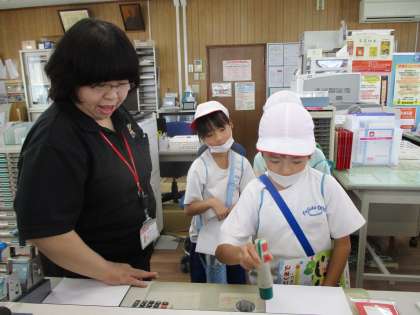 10月25日(水)2年生 生活科 まちたんけん(森郵便局) 公開日 2023/10/25 更新日 2023/10/25 できごと ポストは見たことあるけれど・・・、郵便局の大切な役割を知ることができました。2年生の児童にとっておそらく初めて入る「小野のたから」だったことと思います。丁寧に説明していただいたり、実際に書類の記入等の体験もさせていただいたりしました。ありがとうございました。