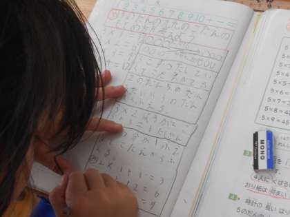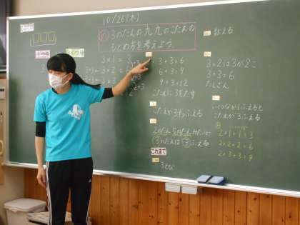 今日は、3のだんの九九の答えの求め方を学習しています。3つで1パックになっているプリンの9パックまでの数の求め方を考えました。これまで学習してきた2の段や5の段のときと同じように考えればいい!よく分かっています。プリンの絵の数を「たいへんだなあ」と言いながら数えてみたり、地道にたしざんしながら数えたりしていました。苦労すればするほど、学ぶことは大きいと思います。