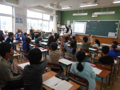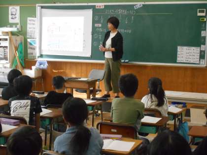 「分数」の学習をしています。「ここでは」1より大きい数も分数で表すことができることを学習しています。ちょうど教室では、8/4mは2mのこと。児童の発見がありました。今日学んでほしいことから発展していました。こうして児童が主役の授業では、どんどんこのあとの課題がつながっていきます。