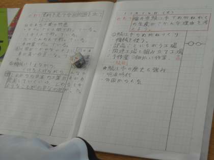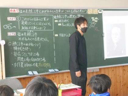「これからの工業生産と私たち」では、昔から伝わる技術を生かしている伝統工業について学習しています。世界に「めがねのまち」として知られている福井県鯖江市の例をとりあげ、鯖江市の歴史や強みをポイントにして考えていました。ただ単に盛んということではなく、なぜ盛ん?どう盛ん?人々にとってどんないいこと?教科書には載っていないことですが、先生とのやり取りによって5年生の関心が高まっています。