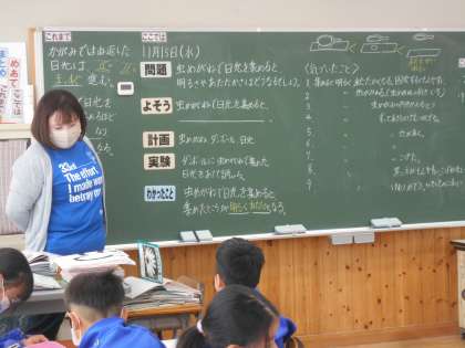 ちょうど教室では「太陽の光」で学習してきたことのまとめをしていました。鏡や虫眼鏡で日光を集めた実験のことを思い出していました。家や学校のなかでも外でも、どこにいても私たちは日光とともに生活しています。「ここでは」の学習で学んだことをうまく生かして生活を豊かで便利にしていくことができますね。さらに3年生は、危険なのでやってはいけないこともしっかり学習しています。理科の学習でとても大切なことです。