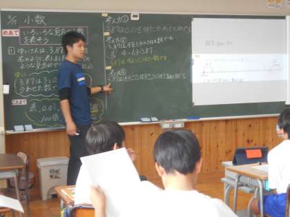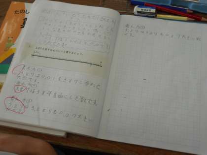 小数の数の見方について学習しています。教室では「3.87」の見方を考えていました。まずは数直線の目盛りを使って考えはじめました。「ここでは」学習してきた小数のしくみについてきちんと理解していなければならないことも確認していました。もっと違う見方で表してみたい!という児童もいました。