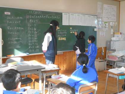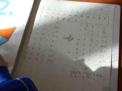 11月20日(月)2年生 算数 公開日 2023/11/20 更新日 2023/11/20 できごと 今日は、8のだんの九九の求め方を考えていました。「これまで」7のだんまで学習してきたときに考えてきた作戦を使って真剣に考えていました。これまでと同じ考え方かもしれませんが、先生は一人一人の考えをしっかり自分の言葉で発表させていました。自分が考えたやり方をきちんと自分の言葉で説明できる2年生です。