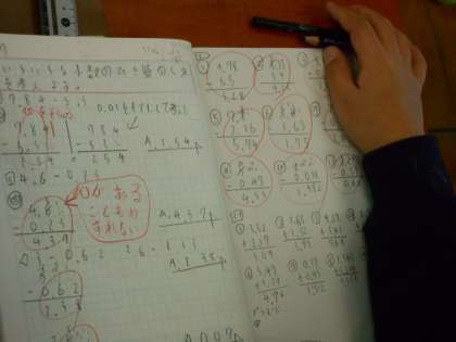 11月20日(月)4年生 算数 公開日 2023/11/20 更新日 2023/11/20 できごと 「小数」の学習がいよいよ最終段階に入りました。今日は、いろいろな小数のひき算の筆算の仕方を考えていました。「ここでは」いつでも、どんな計算でも、位を揃えることを大切に意識して計算しています。今日もそうです。児童のノートを見ていると、正解の赤丸がたくさん見られました。嬉しそうでした。