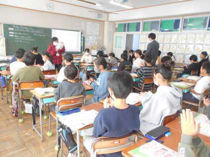 Unit 6「What would you like?」の学習では、レストランなどでの丁寧な注文の仕方や値段の尋ね方について学びます。ちょうど教室ではとても楽しそうにペアでゲームをしていました。「味」の言い方についてALTの先生の発音を正しく聞き取るゲームです。児童にとっては聞き分けづらい2つの言葉の聞き取りがバッチリよくできるようになっていたので大変感心しました。正しく聞くことができるのはよいコミュニケーションの大切なポイントです。