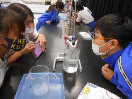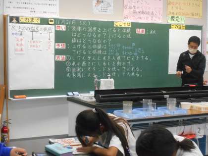 「ものの温度と体積」。今日は、水の温度と体積の関係について、実験を通して学習していました。先日の空気の実験のときと同じように、試験管、氷水やお湯を使って調べました。一生懸命考えた予想はあたっていたかな?結果はどうだったかな?空気のときの実験と比べてどうだったかな?「ここでは」学習したことが、生活の中で活躍できることがありそうですね!