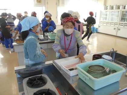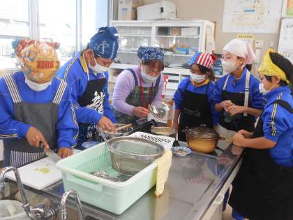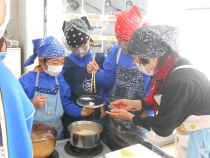 調理実習では、料理のプロであるおのハンモックのボランティアの方々にお世話になりました。お味噌汁の大根がやわらかくなったかどうかを確認するためには?教科書には載っていない主婦の知恵も伝授していただきました。(写真下)