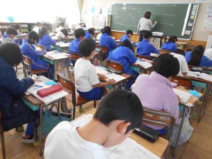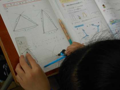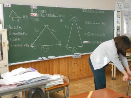 「三角形と角」の学習をしています。今日のめあては「二等辺三角形名人になろう」です。ちょうど教室では、今日学習したことをもとに、二等辺三角形をかいていました。初めてのコンパス、定規をうまく使って皆真剣です。この課題をクリアしたあと、オリジナル二等辺三角形をつくる!を楽しみにしているから真剣味がさらに増しています。