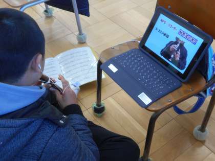 ちょうど音楽室では、楽器ごとに個人練習を進めていました。上手に演奏できるようにするには、どう練習を進めていくか?先生は1人しかいません。自分で考えて工夫していました。個人で苦手なところを繰り返す子、友達同士で聞きあい、教えあいながら進める子、また先生の見本演奏の入ったタブレットをうまく活用して進める子など色々でした。自分の技術をしっかり把握し、目標達成に向けてどうしたらよいか、こうして考えられる6年生です。