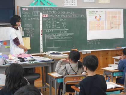 「1000より大きい数」の学習です。ちょうど教室では、「くらいに なかまが ふえたね!」「あたらしい おともだち!」と児童が喜んでいました。今日は、「千のくらい」を学習しました。こうやって、数字では、100の集まり、1000の集まりと「くらい」を大切に考えることができるようになっています。