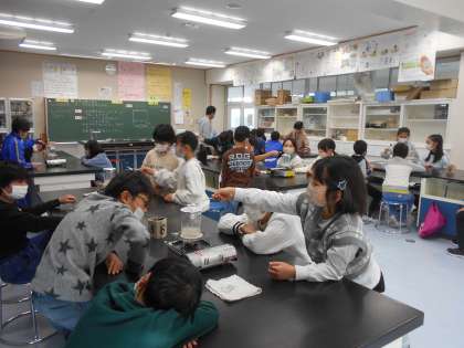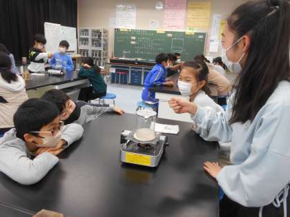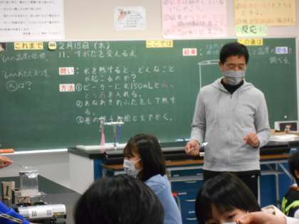 2月15日(木)4年生 理科 公開日 2024/02/15 更新日 2024/02/15 できごと 「すがたを変える水」を学習しています。今日は水を熱した時の様子を観察していました。湯気にスプーンを近づけたとき、スプーンの下をのぞき込んでいました。「ここでは」水は、温度によって状態や体積が変化するといった水の性質について、実験等を通して学びます。もちろん、安全第一で、みんなで気を付けながら上手に実験ができました。