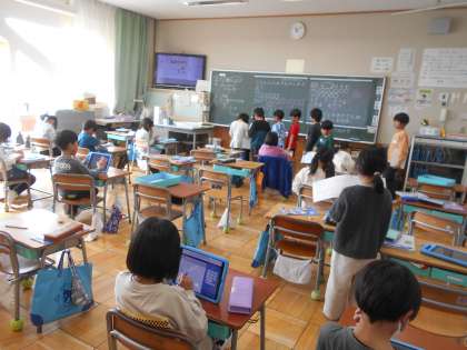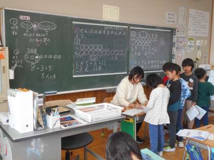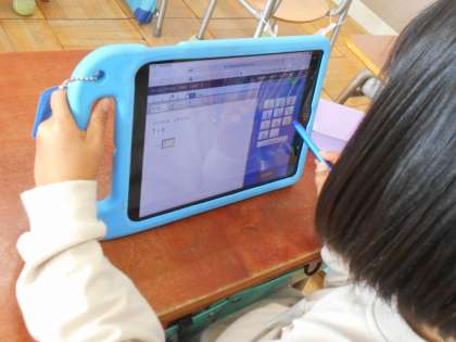 「ずを つかって かんがえよう」を学習しています。「ここでは」場面を図で表して考えることで、どう計算すればよいかが分かるようになります。どんな場面で何を知りたいのか、しっかりと理解することが大事です。ちょうど教室では、考えたノートを先生に一人一人見てもらっていました。できた児童はタブレット上でどんどんドリル問題に挑戦します。〇をもらえてほめてもらえてうれしそう!そしてさらにドリルにチャレンジできてまたうれしそう!1年生はやる気いっぱいです。