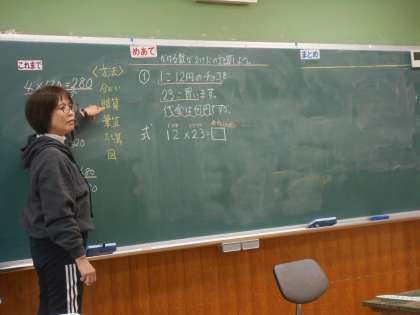 「2けたの数をかける計算」の学習に入りました。「ここでは」12×23や214×34などと、さらに大きな数のかけ算ができるようになります。ちょうど教室では、12×23の計算の答えをどうやって導こうか?頭を悩ませていました。「これまで」使ってきたいくつかのやり方を思い出して、考えていました。なかなか難しそうでした。でも、ここで、こうして悩むからこそ、「ここでは」の学習内容のより確かな理解につながるのです。