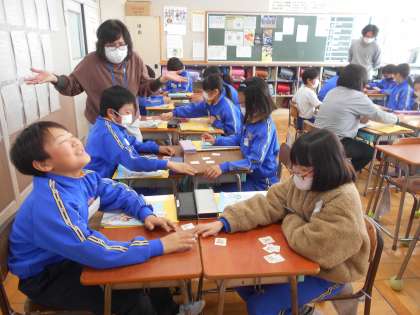 「Unit 9 This is my day.」に入りました。「ここでは」日課を表す英語を話したり聞いたりして親しみます。ちょうど教室では、それらの表現のカードを使って、ペアでゲームをしていました。4年生はこのようなペアでのゲームを通した活動がいつも充実しています。それは、どんなに勝敗がかかっていても仲良く、お互いに気持ちよく取り組むことができるからです。