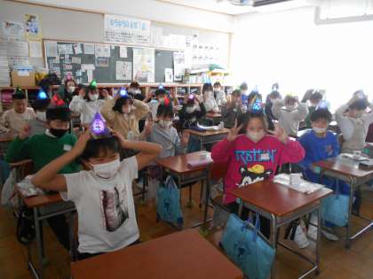2月21日(水)4年生 図工 公開日 2024/02/21 更新日 2024/02/21 できごと 「プッシュステンド」でオリジナルのライトをつくり、今日は、5時間目に1組で「点灯式」をして楽しんでいました。ラッキーなことにその場に立ち会うことができました!とってもきれいでした。ライトの色が変わるので、いろいろなデザインを楽しむことができました。形や色の感じを存分に楽しんでいました。すてきです!