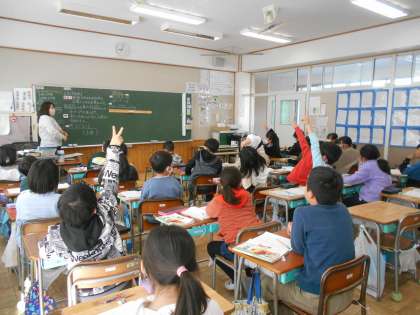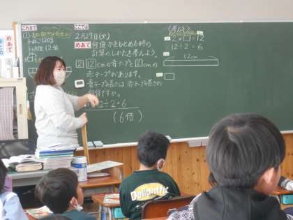 「倍とかけ算、わり算」の学習をしています。今日は何倍かを求めるときの計算を考えていました。今日の問題に対して児童が自分の考えを発表しているところでしたが、先生からは、どうしてそう考えるのか?児童に質問がとびます。なんとなく分かっていて答えが出るけれど・・・、どんなに時間がかかっても、児童は真剣に考えます。みんなで一緒に考えて、だんだんとヒントになる言葉が出てきて、少しずつ説明できるようになってきて、「たどりついた!」時にはスッキリ達成感です。もちろん力もつきました。