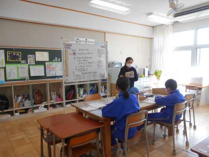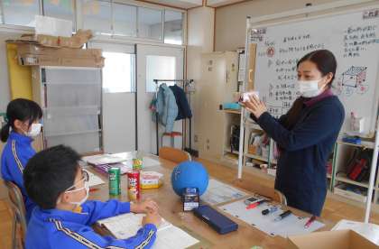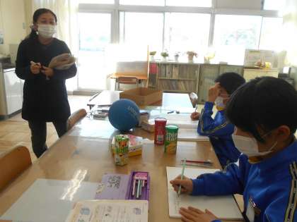 4年生は、算数「直方体と立方体」の学習で、直方体と立方体の頂点、辺、面の数を調べる学習をしていました。どう求めたか、きちんと立式することもでき、先生が感心していました。机の上にはいろいろな直方体や立方体の実物があるので、それが大切なヒントになっていました。