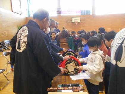 実際に獅子頭や太鼓などに触らせてもらいました。3年生は大喜びでした。また、400年近い歴史のことなど、森の獅子舞のことを詳しく知ることができて、さらにこの小野の地域に誇りをもてたことと思います。今週末には、飯玉神社で春祭りが行われます。児童はその日を楽しみにしているようです。