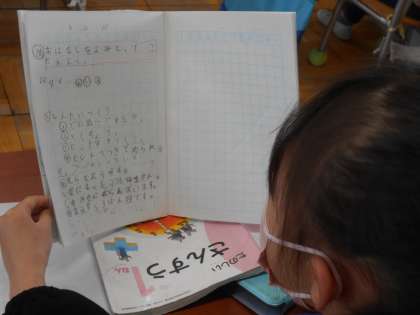 「タマをさがせ」を楽しそうに学習中です。「ここでは」かわいい猫がたくさん集まっているお祭りの絵を見て考えます。いくつかの情報を正しく読み取ってタマをさがしたり、自分が選んだ猫のタマに関する情報を口にして友達にクイズとして出したりしていました。私が教室に入ったときは、友達が少し悩むようないい問題を出題している子がいて、先生も感心していました。