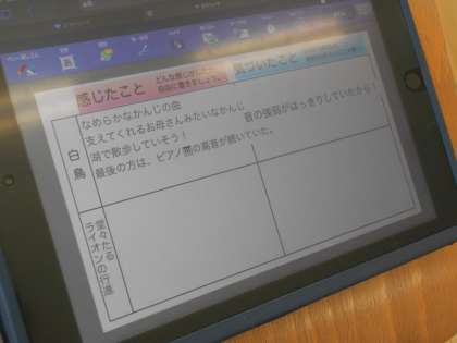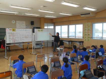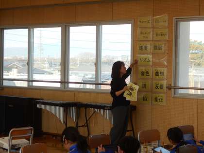 3月14日(木)4年生 音楽 公開日 2024/03/14 更新日 2024/03/14 できごと 「せんりつのとくちょうを感じ取りながらききましょう」の学習です。「ここでは」「白鳥」と「堂々たるライオンの行進」の2曲を鑑賞し、曲の感じを味わったり、2曲を比べたりします。ちょうど音楽室では、感じたことや気付いたことをタブレット上で共有していました。特に気付いたことについては、「これまで」学習してきている音楽をつくる要素(学習につながるつなぎ教材として常時掲示)が生かされます。