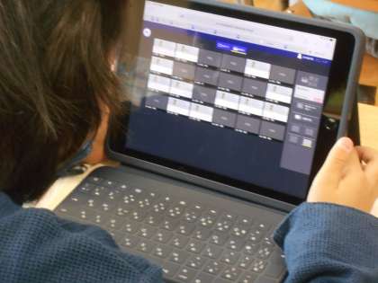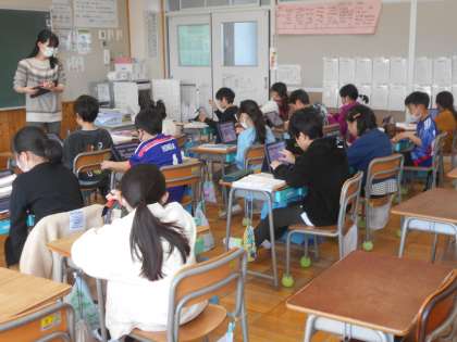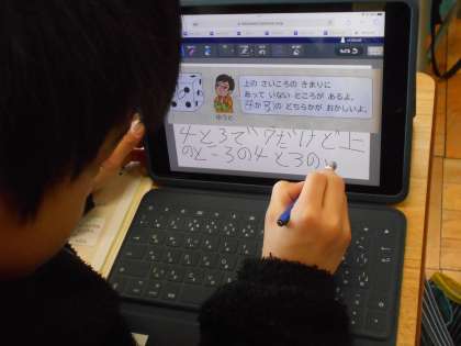 「見えない数はいくつかな」を学習していました。さいころあそびのきまりに合っていないさいころを見て、どこがきまりにあってないのか?なぜそう考えるのか?自分で考えてタブレット上で友達の考えを見ていました。2年生も、タブレットを活用して、学習を深めています。