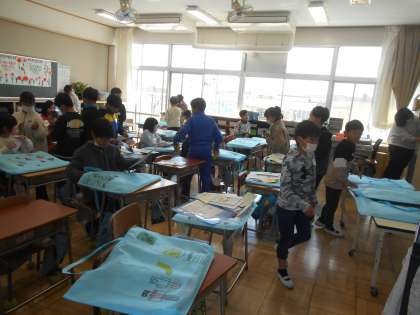 3月21日(木)3年生の教室光景 公開日 2024/03/21 更新日 2024/03/21 できごと 3年生も1年間の学習をふりかえっていました。学習の成果物等を入れて持ち帰るための作品バッグに思い思いのイラストをかいていました。クラスの友達の似顔絵を描いている子が何人もいました。大切な友達と一緒に学んだことをつめこみ、世界にひとつだけのかけがえのない大切な思い出のバッグです。なんだかジーンとしてしまいました。