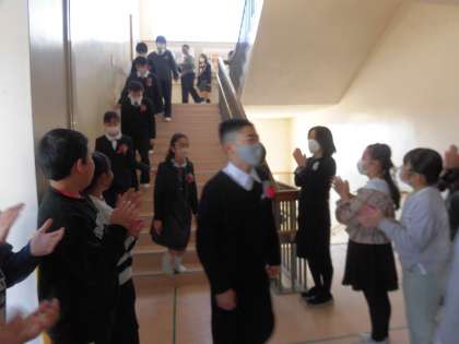 今朝の在校生によるお見送りの様子です。登校班、レインボーなど特別な時の活動だけでなく、日々の休み時間にも、本当にたくさんの場面で優しくしてもらった6年生に「おめでとう!」「ありがとう!」をたくさん伝えました。