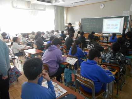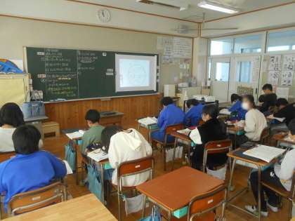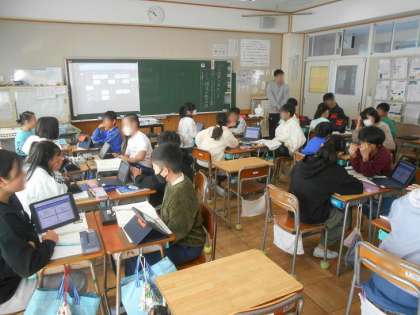 3組は国語。視覚で捉えたものを詩で表すために、写真を使って言葉で表す練習をしていました。