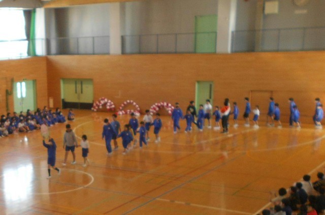 全校の友達みんなで1年生を向かい入れ、一緒に校歌を歌いました。