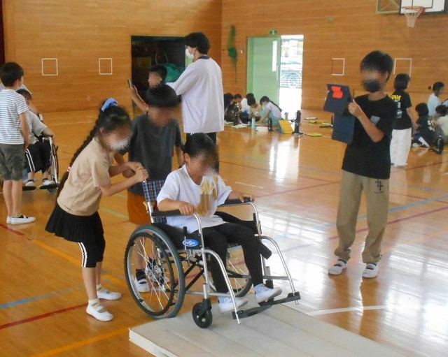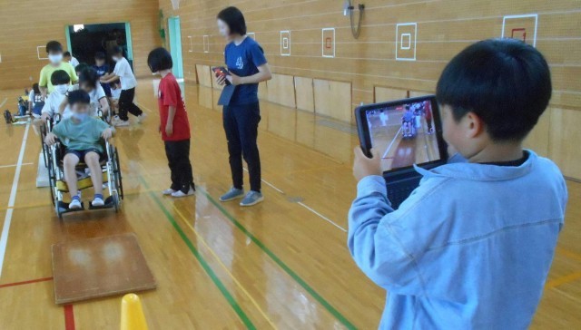 5月21日(水)車椅子体験(5年) 公開日 2025/05/21 更新日 2025/05/21 できごと 総合的な学習の時間に5年生が「車椅子体験」をしました。 手足が不自由な人の立場、介助する人の立場の両方を体験しました。 少しの段差でも乗り越えることが難しいことや傾斜が少しでもあると不安や恐怖感があることなどが分かりました。 この体験を基に、バリアフリーについての学習を深めることができるといいなと思います。