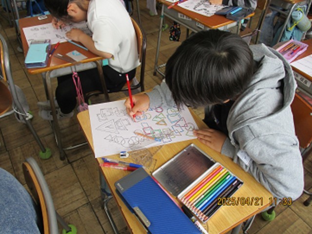 図工「形を重ねて」にチャレンジしました。丸、四角形、三角形だけでなく、いろんな形...