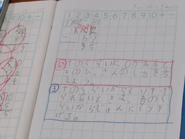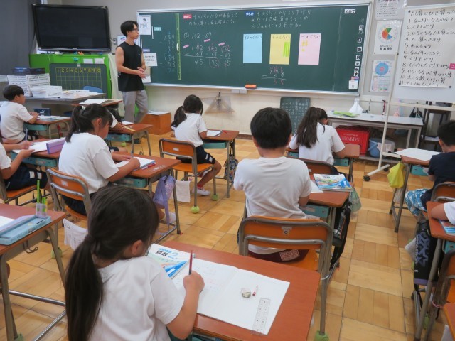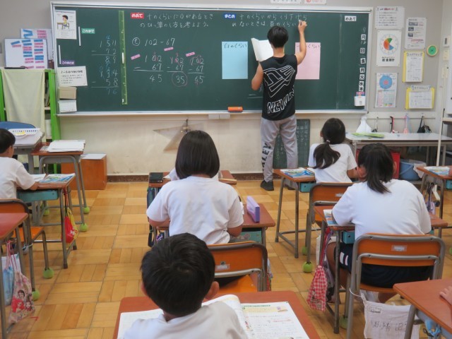 9/12 算数の授業 公開日 2025/09/12 更新日 2025/09/12 できごと 2年生は、算数「繰り下がりのあるひき算」にチャレンジしていました。 位ごとに、タイルを動かす操作を繰り返すことで、「繰り下がり」のイメージをつくっていました。